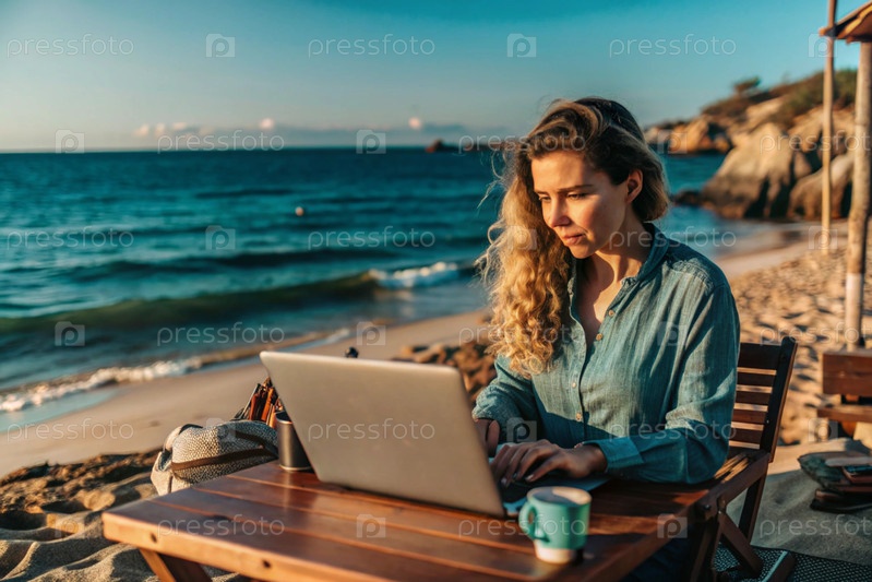 Молодая женщина-фрилансер работает на ноутбуке, отдыхая у моря или делая покупки в Интернете