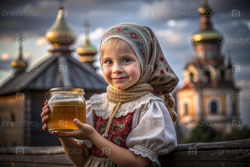 Концепция российского православного праздника 'Мед Спаситель' - красивая маленькая девочка в русской национальной одежде и шарф с баночкой меда на фоне православной церкви