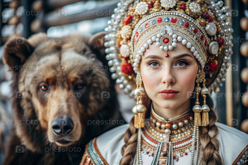 Красивая девушка в традиционном русском национальном костюме.Перед живым медведем.Портрет символизирует традиции и красоту русского народа
