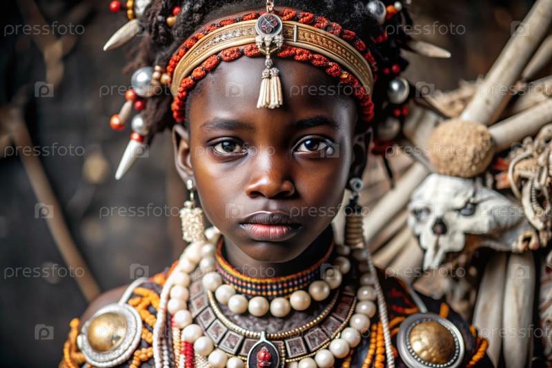 Красивая африканская девушка в традиционном национальном костюме. с костями. портрет символизирует традиции, культуру и красоту африканского народа