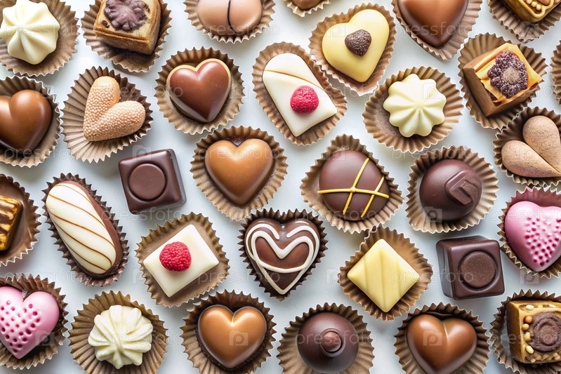 Ассортимент изысканного шоколада, белого, темного и молочного. История сладостей. Концепция Дня святого Валентина