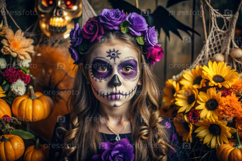 Концепция Хэллоуина. Ужасно. Костюмированная вечеринка. Красивая женщина с покрашенным черепом на лице и цветами на голове. Баннер, открытка