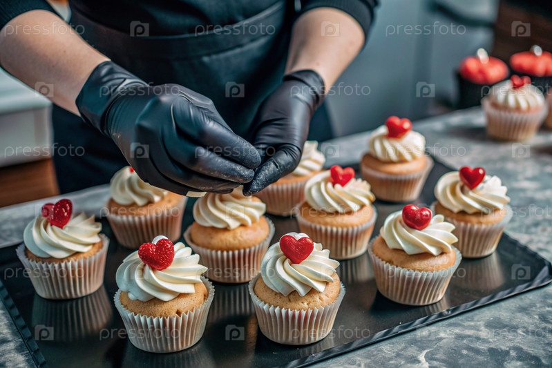 Профессиональный кондитер в черных перчатках украшает кексы сливочными и красными сердцами