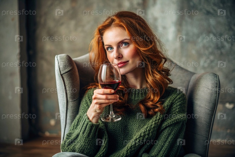 Современная, стильная, красивая женщина с рыжими волосами и бокалом красного вина на стуле в гостиной дома