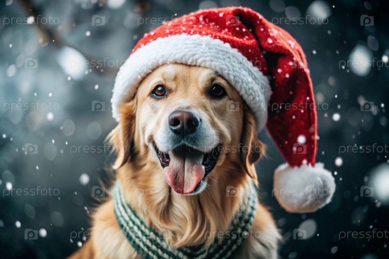 С Новым годом и Рождеством! Падает снег. Веселая собака Золотой ретривер сидит в шляпе Санта-Клауса