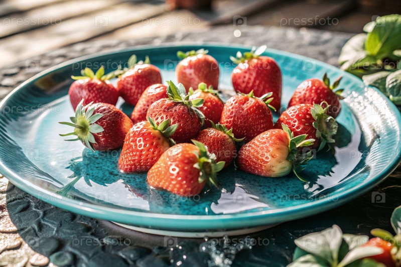 Закрытие свежих клубники. Вкусные ягоды и фрукты ярко-красные с капельками воды. Вегетарианство. Здоровое питание. Свежие плоды на столе