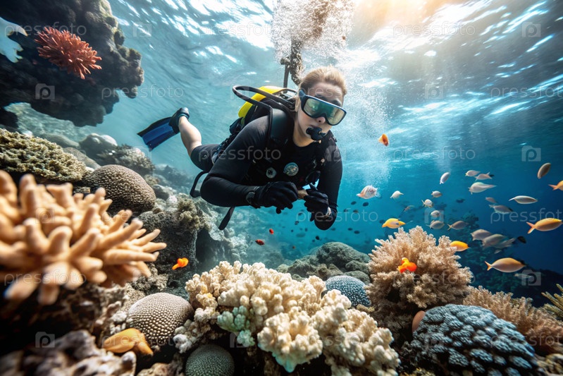 Свободный дайвер возле кораллового рифа. Скуба ныряет в гидрокостюме. Подводное погружение