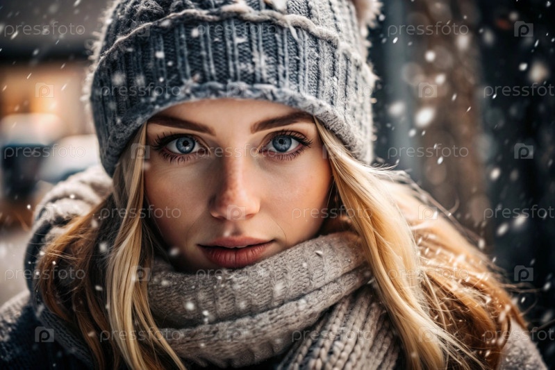 Зимний портрет: блондинка с ярко выраженными голубыми глазами в вязанной шляпе, шарфе и свитере