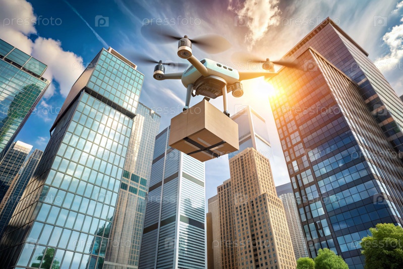Технология будущего. Дрон доставки несет картонную коробку для человека на веревке. Дрон доставки летает между современными небоскребами. Концепция развития доставки товаров