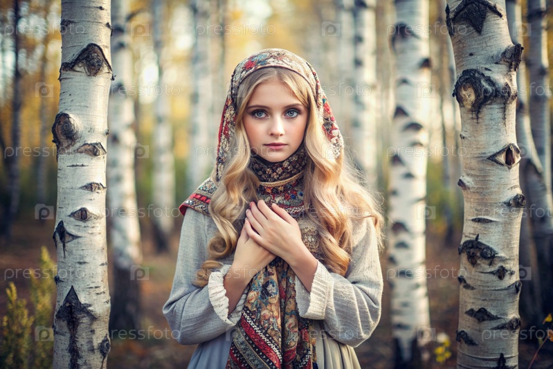 Красивая девушка в традиционном русском народном шале в летней березовой роще.Портрет символизирует традиции и красоту русского народа
