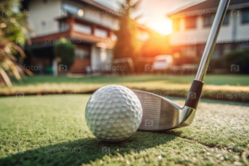 Баннер. белый мяч и металлическая клюшка для гольфа лежат на газоне в руках мужчины среди заката солнца. реклама матча по гольфу в кантри-клубе. свободное место для текста