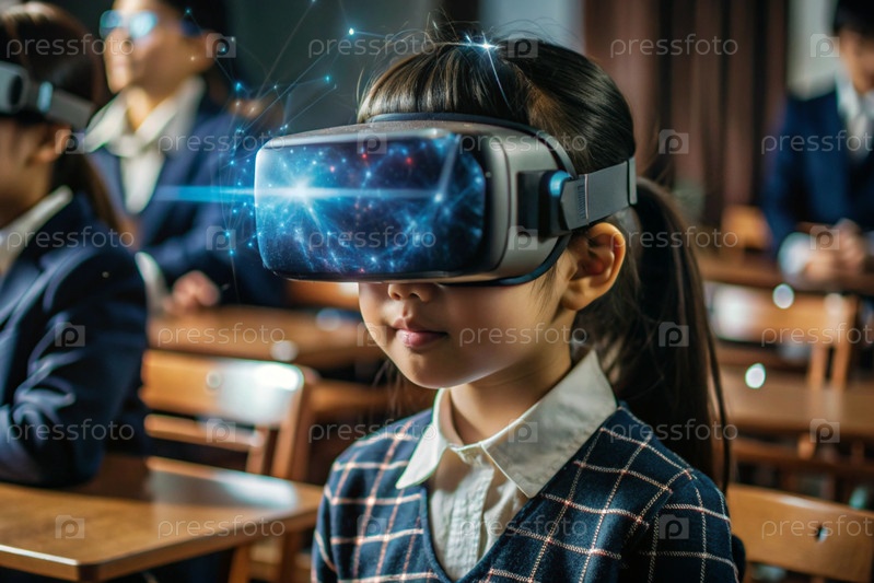 Азиатская девушка с очками виртуальной реальности.Ребенок находится в классе, а другие ученики на заднем плане.Цифровой интерфейс отображается в наушниках