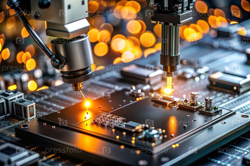 Автоматизированное производство электронных устройств. Современные роботизированные манипуляторы на сборочной линии чипов и печатных платок на современном электротехническом заводе. Установка компонентов на доске