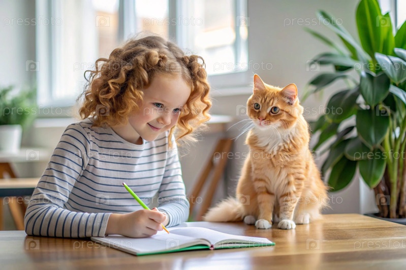 Образование и обучение. маленькая кудрявая девочка делает домашнее задание. ученик выполняет школьное дома. рядом со мной сидит рыжеволосая кошка