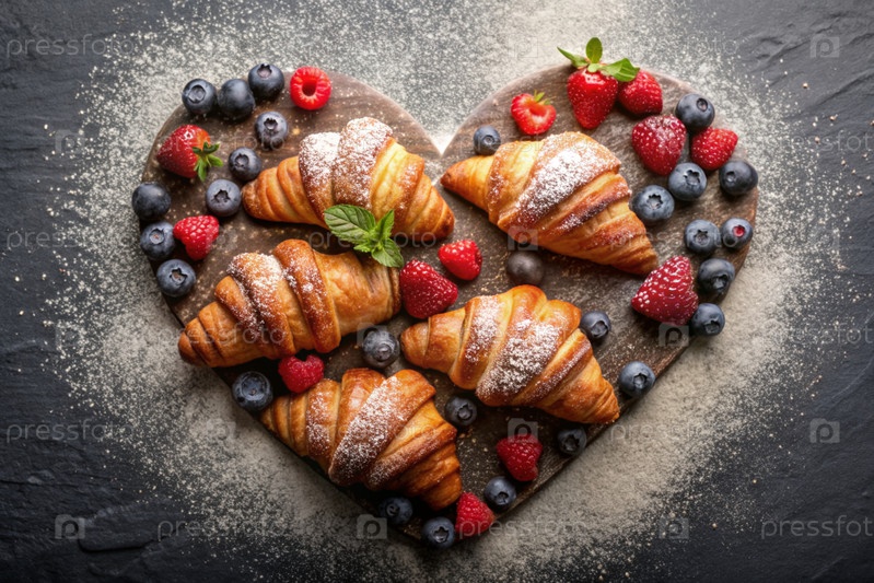 Вкусные свежевыпеченные кроассанты и ягоды в форме сердца на тёмном фоне сланцевого камня. французский завтрак. хорошие ближневые выпечки. пекарня со вкусным хлебом. кондитерские изделия
