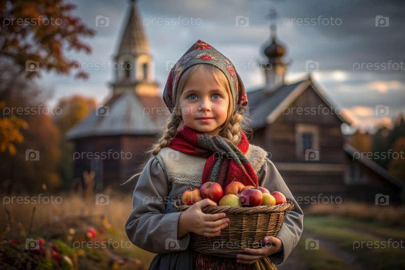 Красивая девушка в русской национальной одежде с корзиной спелых красных яблок на фоне православного храма