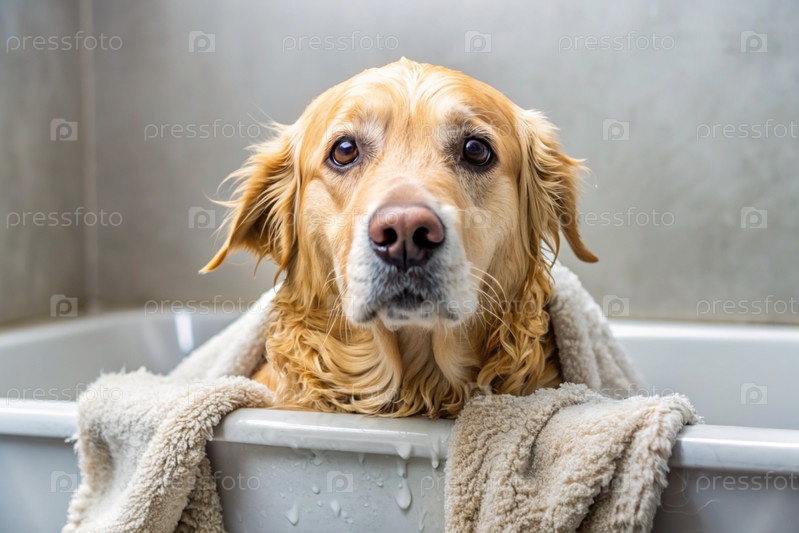 Золотой ретривер купается в пузырьковой ванне. Помыть собаку. Концепция ухода за домашними животными