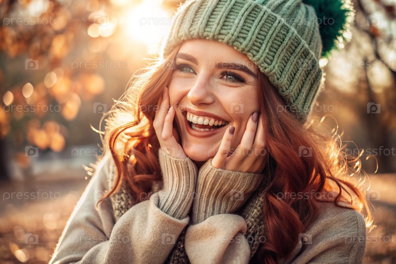 Осенний портрет. Близкий план молодой рыжеволосой женщины с ярко выраженными зелеными глазами в вязанной шляпе и свитере. Девушка смеется под лучами закатывающегося осеннего солнца