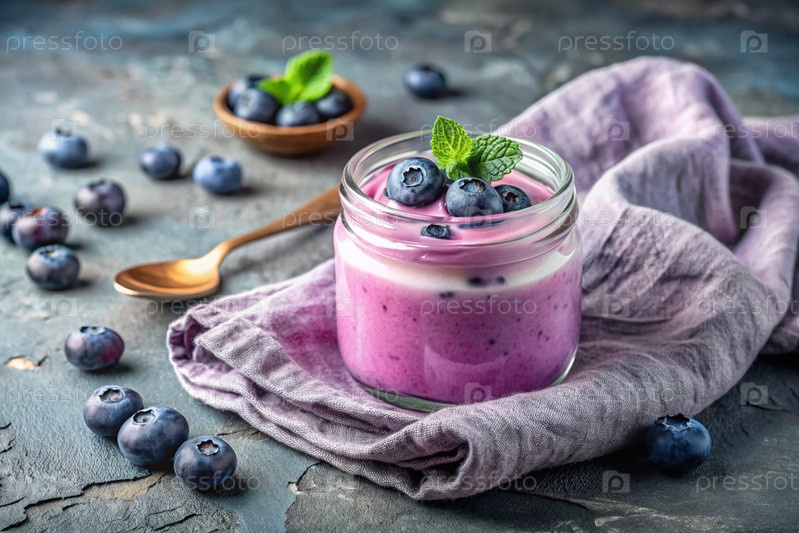 Домашнее голубиное йогурт со свежими чернилами, винтажная ложка и полотенце на стильном сером фоне