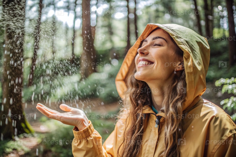 Счастливая молодая женщина в плаще наслаждается дождем на фоне зеленого леса, концепцией наслаждения естественной спокойной жизнью, окружающей средой, образом жизни