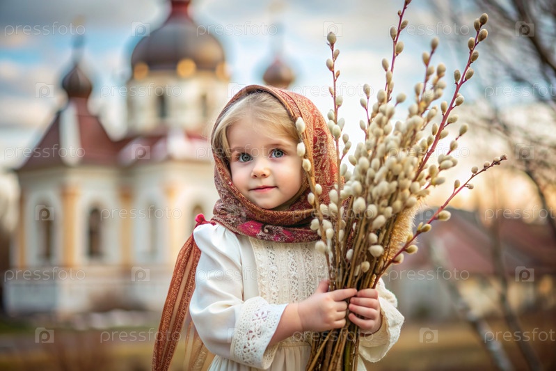 Пальмовое воскресенье. христианство. портрет трехлетней девочки в русском народном шале с ветвями ивы в руках на фоне православной церкви