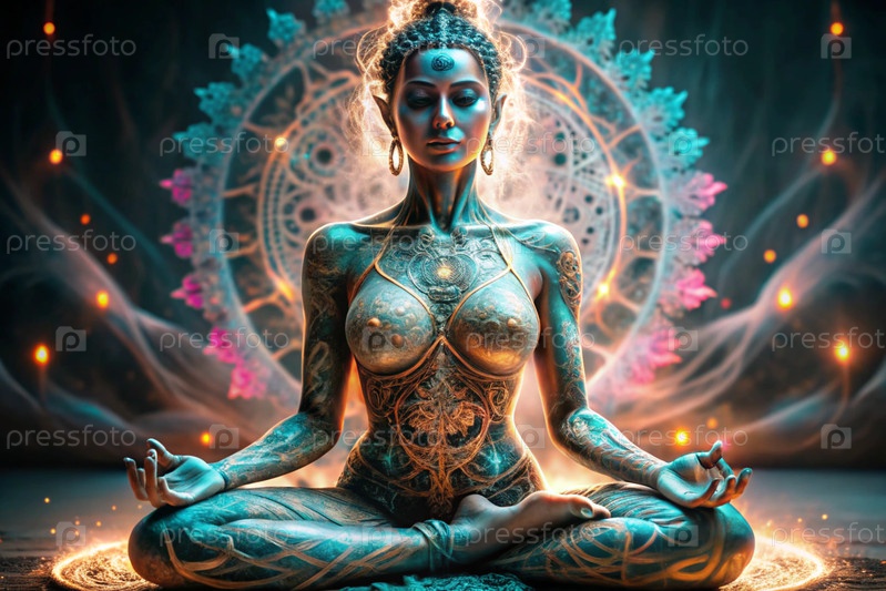 Концепция эзотерической духовной медитации, женщина в позе лотоса.Человеческая медитация, духовность и активация чакр, мистический дух