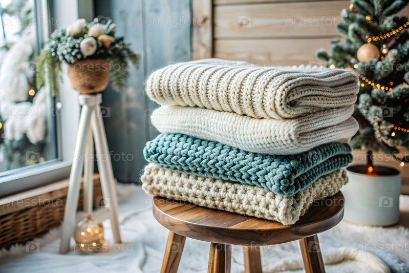 Близко, вяжу тёплую одежду на деревянном стуле в комнате.Зимний сезон, малый бизнес, ручная одежда