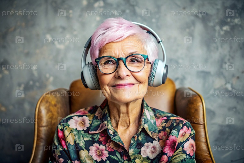 Стильная, современная, счастливая 60-70-летняя женщина слушает музыку в больших беспроводных наушниках дома, на стуле в гостиной