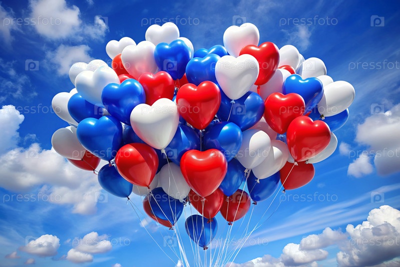 Концепция празднования Дня России 12 июня.Сердечно-образные воздушные шары в цветах триколора России.Белые, синие и красные шарики летают по голубому небу