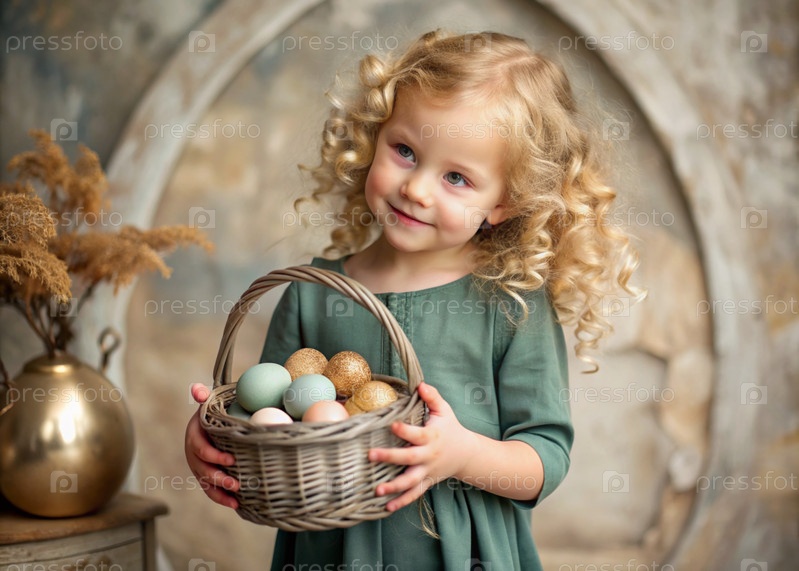 Счастливая Пасха. Христианство. Портрет трехлетней девочки в русском народном шале с плетеновой корзиной с пасхальными яйцами в руках на фоне православного храма