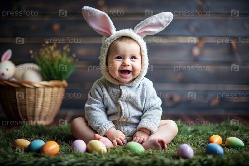 Баннер. Винтажная открытка. Мальчик в костюме пасхального кролика с милыми ушами. Концепция праздника Bright Easter Spring