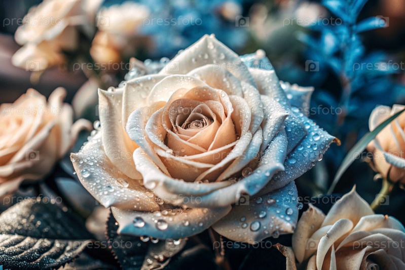 Кремовая роза красивого цвета кофе или шампанского, покрытая росой на рассвете. Красивое солнечное сияние. Фон изображения выполнен в зеленых и бежевых тонах. Естественный, экологически чистый естественный фон