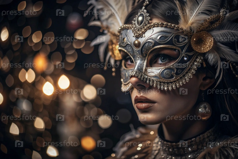 Карнавал Венеции.Закрытие женщины в украшенной карнавальной маске.Яркие цвета передают атмосферу празднования и роскоши