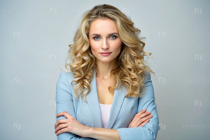 Бизнес-леди с кудрявыми светлыми волосами, она одета в обычный синий блейзер и пиджак.Руки пересекают грудь, смотрит прямо в камеру