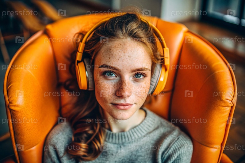 Молодая красивая рыжеволосая женщина с веснушками слушает музыку в больших беспроводных наушниках дома на стуле в гостиной