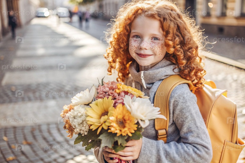 Красивая рыжеволосая девушка с очками и букетом осенних цветов впервые идет в школу. Ребенок со школьной сумкой, книгой и цветами. Малыш на городской улице