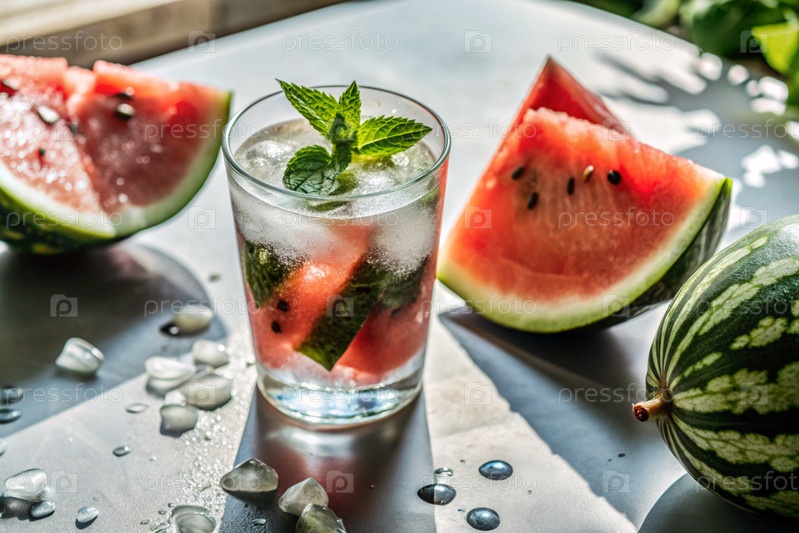 Свежий вкусный арбузный лимонад, мята, кубики льда и кусочки арбуза. летний освежающий напиток