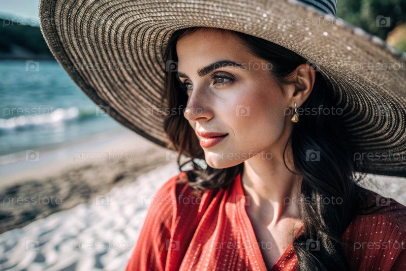 Летние каникулы на пляже, крупный план красивой женщины в соломенной шляпе.Лето.Отдых и отдых, место для копирования