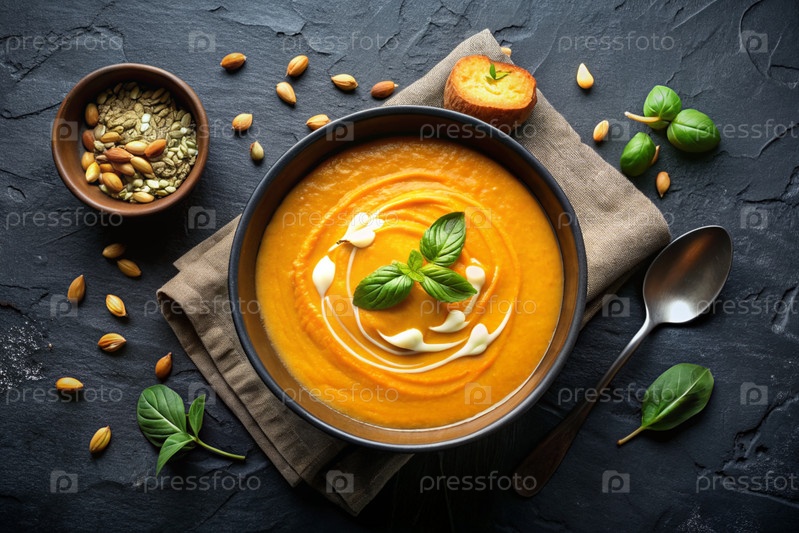 Традиционный мягкий тыквенный кремовый суп с сливками и семьями тыквы на черном бетонном фоне