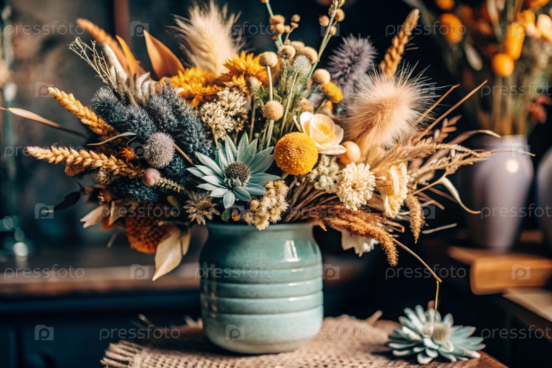 Красивый букет сушеных цветов в керамической вазе на древнем деревянном шкафу. Букет цветов в вазе во внутренней части дома. Светлый, бежевый, синий цветочный фон