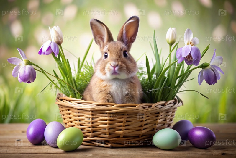 Баннер. пасхальный кролик в корзине из красочных пасхальных яиц вокруг весенних снегопадов и первичной розы. концепция праздника Пасхи