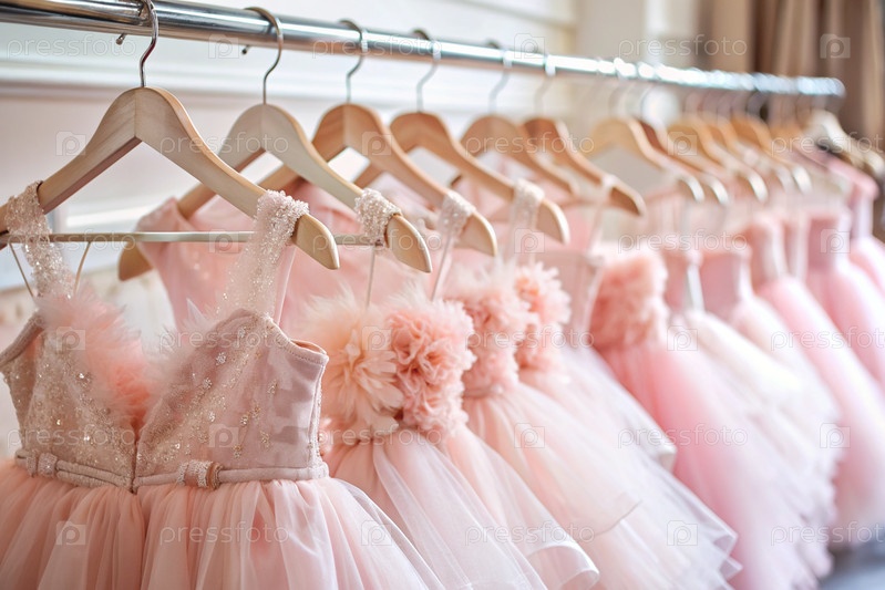 Детские вечерние пушистые светло-розовые платья висят с белых вешалок на палочке в салоне