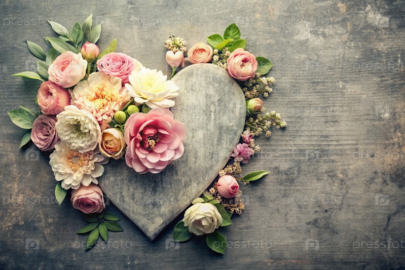 Открытка, баннер Дня матери с розовыми цветами, сердца на винтажном сером деревянном фоне
