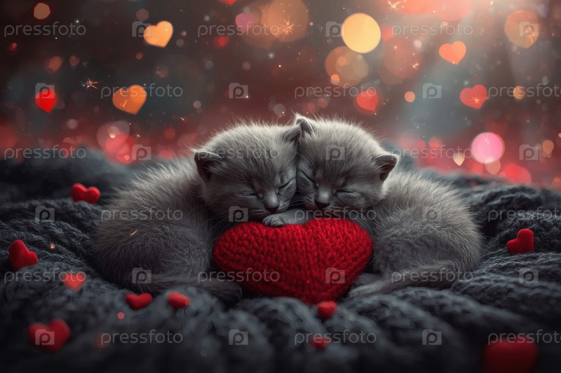 Концепция Дня святого Валентина. красное вязаное сердце и два серых котенка. открытка с котятами на вязанном одеяле