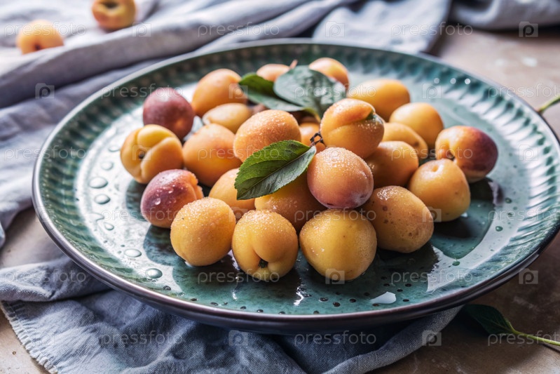 Свежие абрикосы. Вкусные ягоды и фрукты ярко-желтого цвета с капельками воды. Вегетарианство. Здоровое питание. Свежий плод на столе