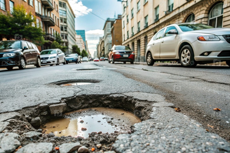 Ужасное состояние дорог. дыра в асфальте на городской улице. ремонт дороги. городская улица плохого качества