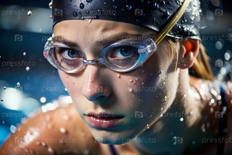 Спортивное плавание. Женское плавание. Спортсменка, которая носит очки для плавания в бассейне во время соревнований на близком расстоянии. Женщина смотрит прямо в камеру