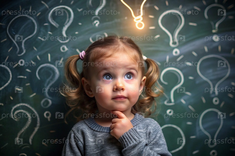 Развитие и образование детей. Вдумчивые девочки на темном фоне с лампочкой и вопросительными знаками. Брайнсторминг и концепция идеи