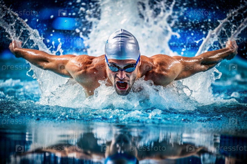 Спортивное плавание. Мужчины-плаватели. Спортсмен с очками в бассейне во время соревнований на близком расстоянии. Человек смотрит на камеру