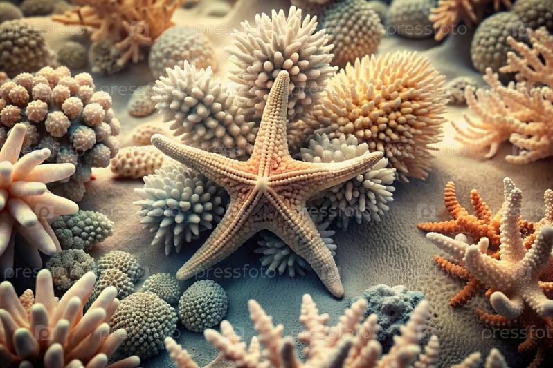 Концепция летних каникул. Подводный мир. Кораллы и морские звезды под водой. Красивый абстрактный фон для баннера